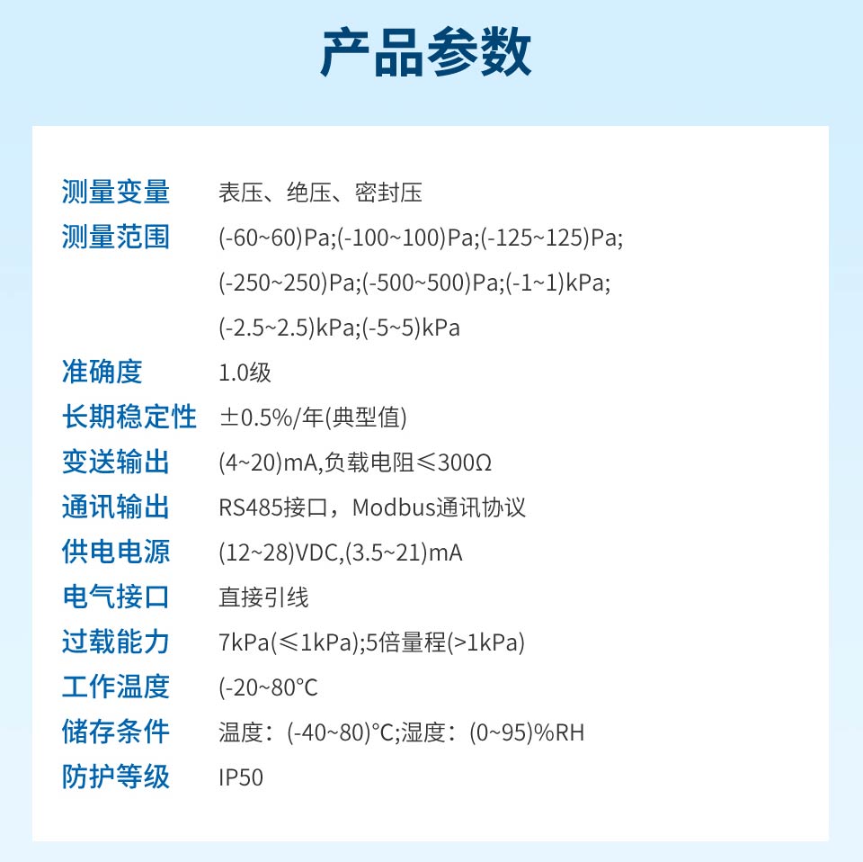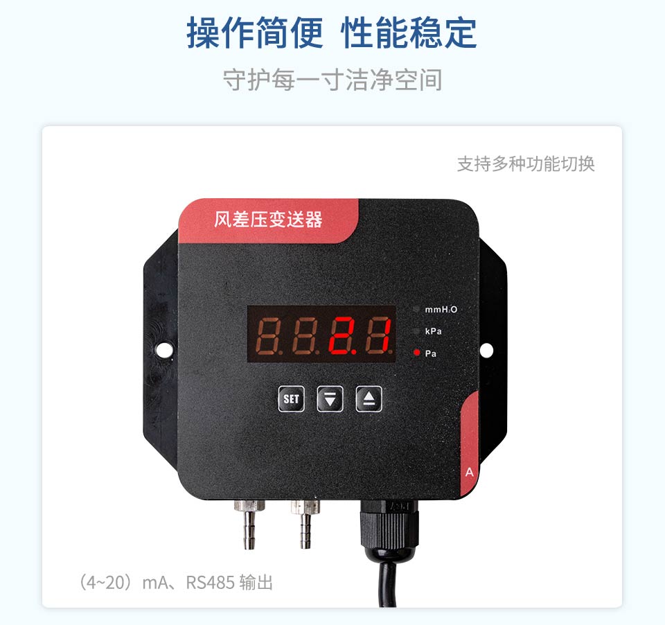 產(chǎn)品描述:數(shù)字風(fēng)差壓變送器采用原裝進(jìn)口差壓傳感器做為感壓元件,配合超低功耗數(shù)字調(diào)理電路,使其具有精度高、長(zhǎng)期穩(wěn)定性好等特點(diǎn)。與機(jī)械差壓計(jì)相同的安裝方式,便于工程人員現(xiàn)場(chǎng)安裝調(diào)試。該系列數(shù)字風(fēng)差壓表可用于潔凈室、手術(shù)室、無(wú)塵室、通風(fēng)系統(tǒng)、 風(fēng)機(jī)測(cè)試等對(duì)于高精度微差壓的測(cè)量與控制。