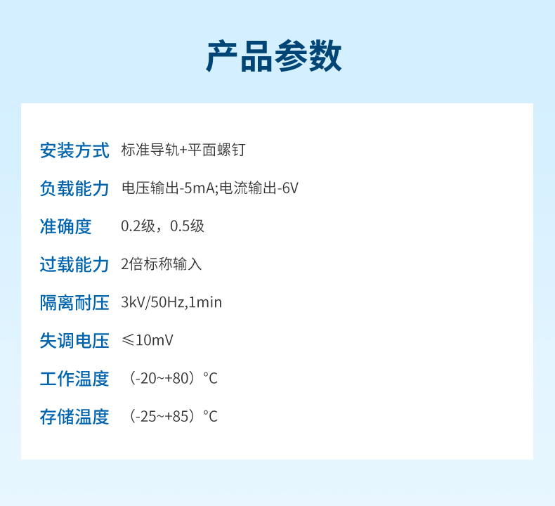 產(chǎn)品描述:電壓變送器是一種將被測交流電壓、直流電壓、脈沖電壓轉(zhuǎn)換成按線性比例輸出直流電壓或直流電流并隔離輸出模擬信號或數(shù)字信號的裝置。