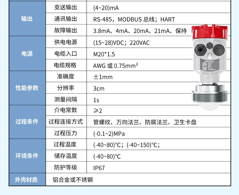 產(chǎn)品描述:本雷達(dá)液位計(jì)檢測(cè)距離遠(yuǎn),波束能量低,可安裝于各種金屬、非金 屬容器或管道內(nèi)。適用于粉塵、水霧、有惰性氣體及蒸汽存在的場(chǎng)合。 雷達(dá)液位計(jì)對(duì)人體及環(huán)境均無傷害,還具有不受介質(zhì)比重的影響、不受 介電常數(shù)變化的影響、不需要現(xiàn)場(chǎng)校調(diào)等優(yōu)點(diǎn)。