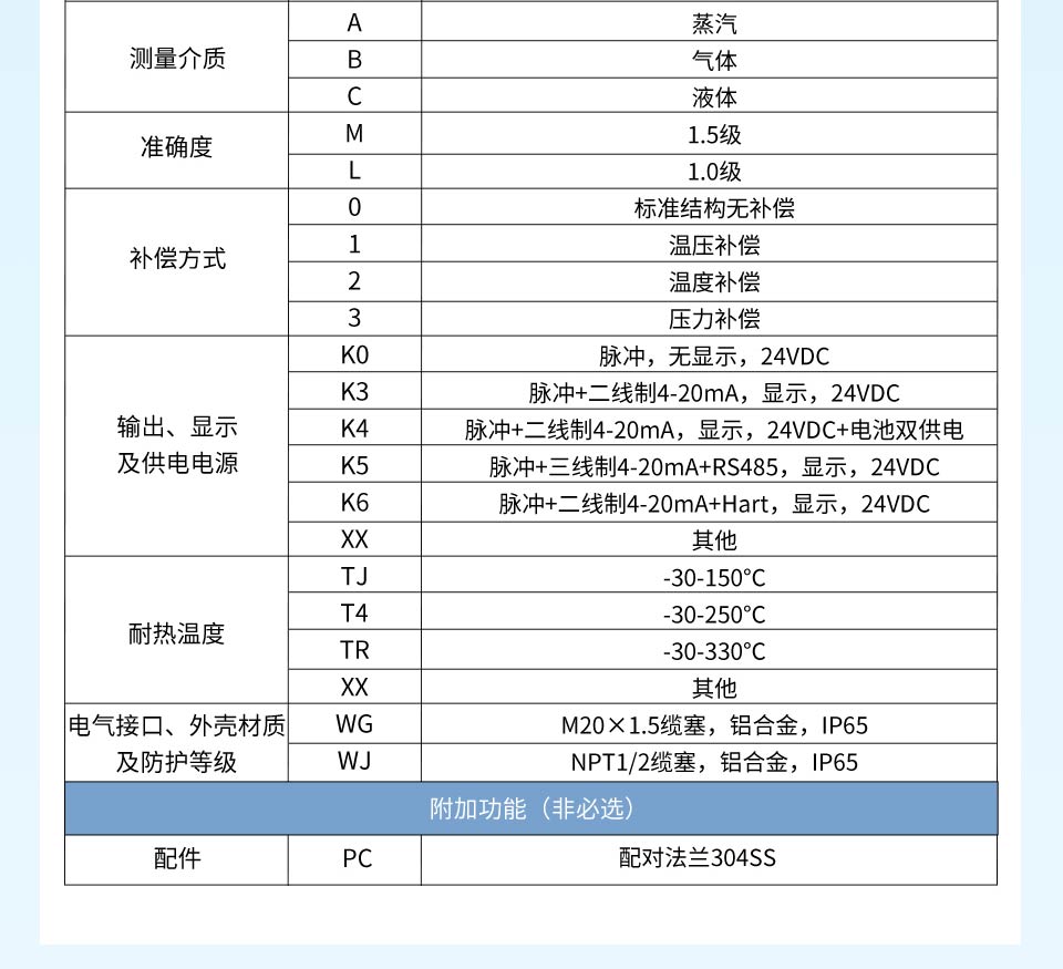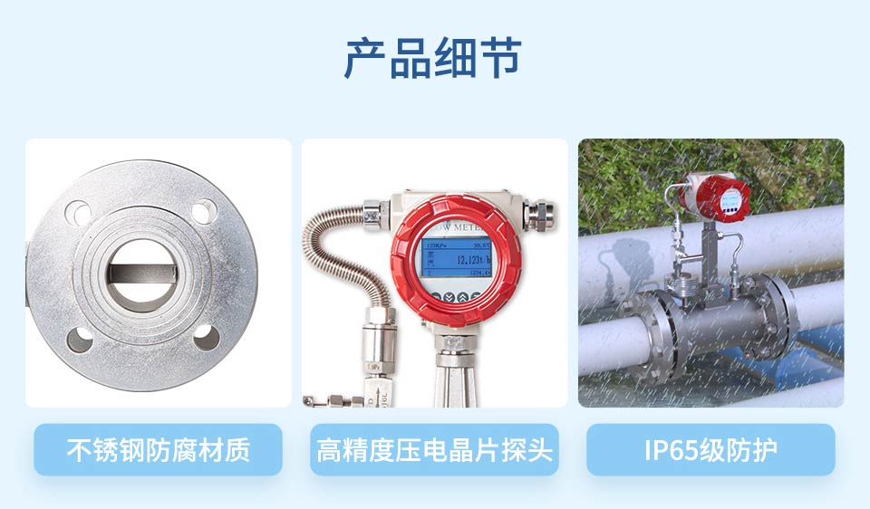 產品描述:渦街流量計是速度式流量計的一種,基于卡門(Karman)旋渦原理研究設計的,主要用于工業(yè)管道中介質流體的流量測量,如:氣體、蒸汽或液體等多種介質的流量控制和計量。渦街流量計廣泛應用于供熱、供氣、化工、環(huán)保、冶金、紡織、鋼鐵、醫(yī)藥、造紙、排水等廠礦企業(yè)對過熱蒸汽、飽和蒸汽、壓縮空氣和一般氣體(氧氣、氮氣、氫氣、天然氣、煤氣等)、水和液體(如:水、汽油、酒精、苯類等)的計量和控制。