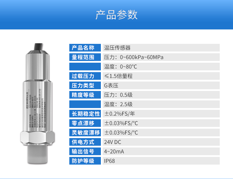 產(chǎn)品描述:溫壓一體變送器是集壓力、溫度一體測量的變送器。 選用高可靠硅壓阻壓力傳感器、熱電阻等作為核心元件, 經(jīng)過溫度補償、數(shù)字電路修正和信號調(diào)理,輸出標準的 工業(yè)信號。產(chǎn)品都經(jīng)過精心設(shè)計、元器件篩選、工藝驗 證固化、循環(huán)加載老煉、環(huán)境模擬測試等過程,保障每 只產(chǎn)品穩(wěn)定可靠。 溫壓一體變送器以其優(yōu)良的準確度和可靠性,廣泛 應(yīng)用于各類壓力測量。尤其在煤礦、油田、化工、環(huán)保、 醫(yī)藥、水務(wù)等行業(yè)。