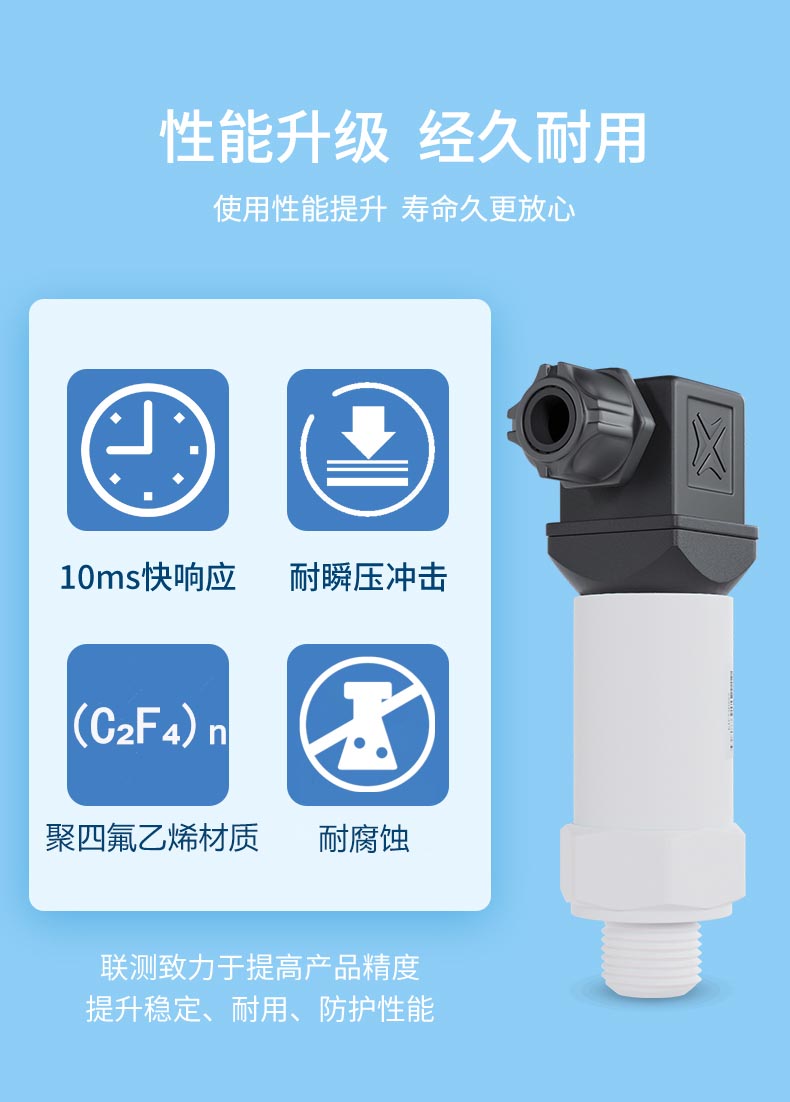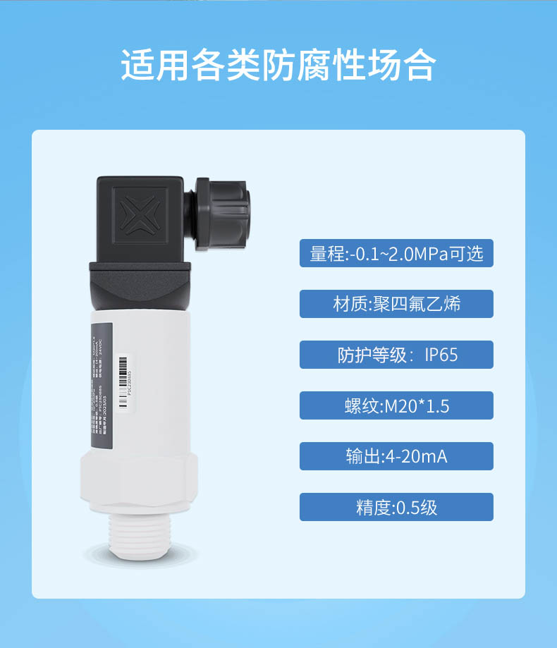 產(chǎn)品描述:防腐壓力變送器選用陶瓷壓阻壓力傳感器,經(jīng)過高可靠性的放大電路及精密溫度補償,將被測介質(zhì)的壓力轉(zhuǎn)換成標準電信號,高質(zhì)量的傳感器及完善的裝配工藝確保了該產(chǎn)品的優(yōu)異質(zhì)量和性能。該產(chǎn)品采用了聚四氟乙烯材質(zhì),具有良好的抗腐蝕性,主要應(yīng)用于化工領(lǐng)域,尤其適用于酸、堿等腐蝕性介質(zhì)的壓力測量