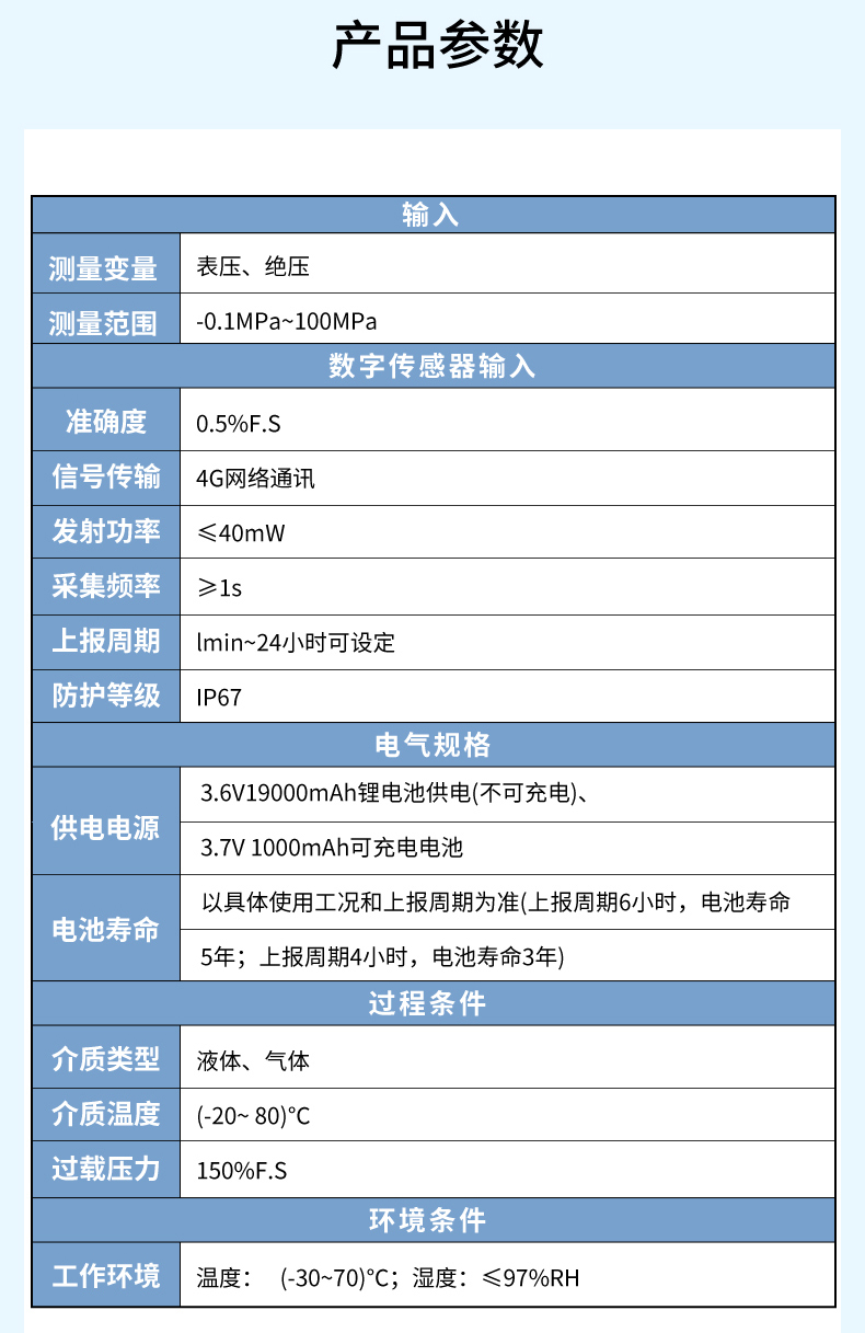 產(chǎn)品名稱: PM800無(wú)線壓力傳感器 4G通訊 電池供電 耐壓100MPA 0.5%精度