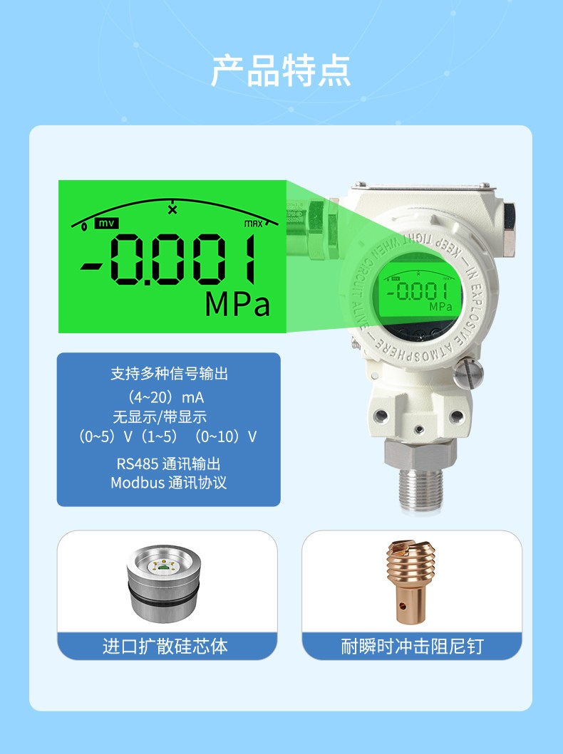 產(chǎn)品描述: 壓力變送器選用進口高精度、高穩(wěn)定性的擴散硅芯體,傳感器內(nèi)采用電子放大器組成,將測量的電信號轉(zhuǎn)換成標(biāo)準(zhǔn)信號(電流、電壓、RS485)輸出。可以直接與計算機接口卡、控制儀表、智能儀表或 PLC 等方便相連。