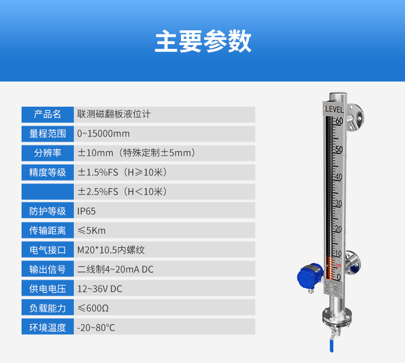產(chǎn)品描述:液位變送器由傳感器和電流轉(zhuǎn)換器兩部分組成,其傳感器部分安裝 在液位計指示器內(nèi)(內(nèi)置式)或不銹鋼保護(hù)管內(nèi)(捆綁式),使其與磁 性液位計處于同一磁耦系統(tǒng)中,當(dāng)液位上下波動變化時,其磁性浮子傳 感器內(nèi)的干簧電阻矩陣中的干簧管,不斷地吸合或釋放,從而導(dǎo)致傳感 器矩陣的輸出電阻值發(fā)生變化,其變化的阻值與液位的變化值成對應(yīng)的 線性關(guān)系,也就是液位的變化轉(zhuǎn)換成電阻的變化,并通過電流轉(zhuǎn)換模塊 將電阻變化轉(zhuǎn)換成 4~20mA 電流變化。