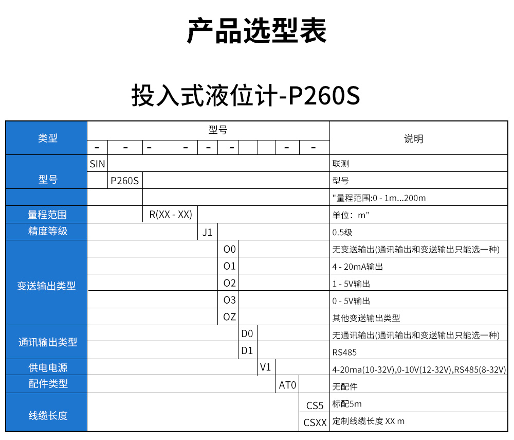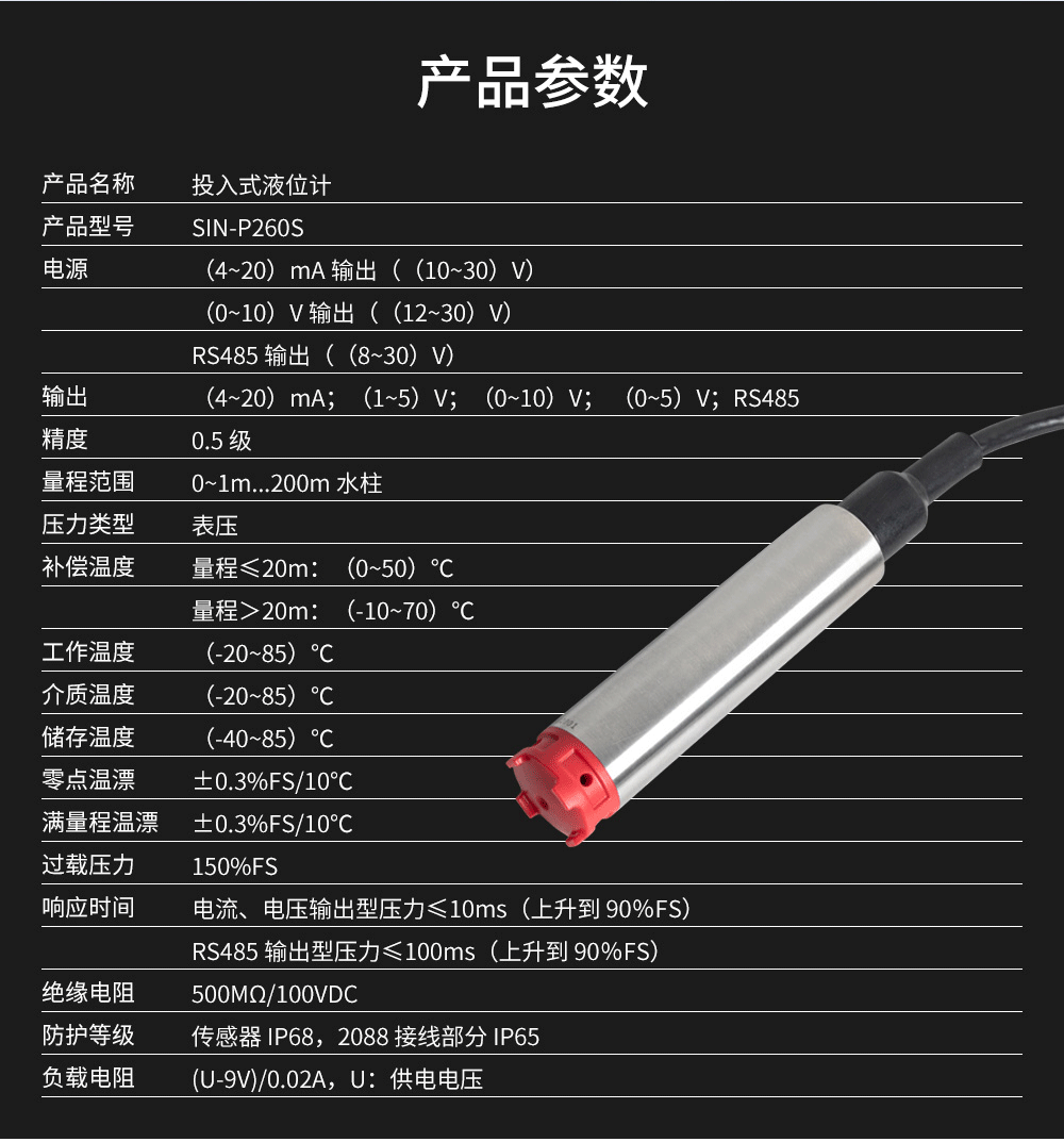 產(chǎn)品名稱:聯(lián)測(cè)_SIN-P260S新款投入式液位計(jì)/水位計(jì)_水箱、水池液位控制器