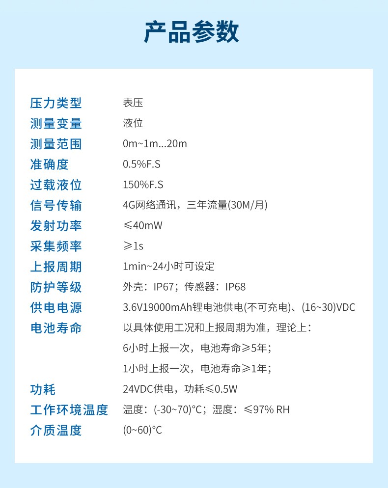 產(chǎn)品描述:無(wú)線投入式液位計(jì)是基于 4G 無(wú)線通訊網(wǎng)絡(luò)使液位的測(cè)量、變送、上報(bào)為一體的低功耗智能儀表。集成高靈敏度液位檢測(cè)元件,高精度信號(hào)調(diào)理電路,低功耗電池電源管理,豐富的 LCD 顯示界面于一體。周期性上報(bào)液位測(cè)量值、電池電量、信號(hào)質(zhì)量等數(shù)據(jù),并且能夠當(dāng)液位超出設(shè)置范圍時(shí)及時(shí)報(bào)警,提前預(yù)警故障隱患。本產(chǎn)品適合油田、水利、消防管網(wǎng)、自來(lái)水管網(wǎng)、城市供熱管網(wǎng)等智慧城市應(yīng)用場(chǎng)景。